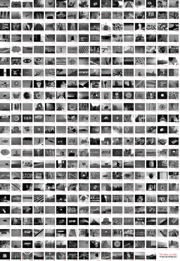ONE YEAR. ONE DAY are two intersecting inventories. Pep Carrió took a photograph every day of 2012, deleting all but one image at the end of each day: 366 remained, as it was a leap year. In early September 2014, Grassa Toro decided that on 24 October, no matter what happened, she would write down everything she did from the moment she woke up until the end of the day, and she did. The inventories were found on 14 November 2014 at a conference for ñh11; that same day they were found on a poster; on 1 March 2015 they will be found in an exhibition at La CALA.