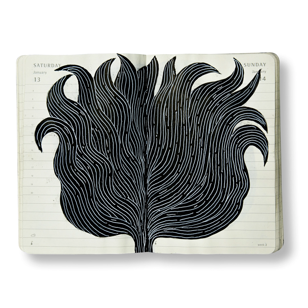 El planteamiento: crear una imagen diaria sobre una agenda dietario. Las reglas: no pensar demasiado antes de abrir el cuaderno, la imagen debe ser creada de una sola vez, dedicar un tiempo acotado a la ejecución, no dejar de hacerlo un solo día.